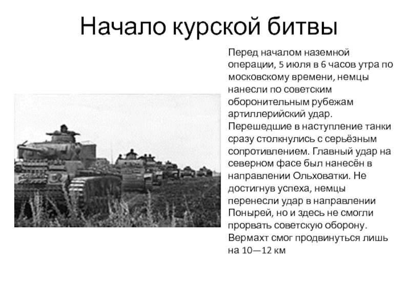 московскому времени, немцы нанесли по советским оборонительным рубежам артиллерийский удар. Перешедшие в наступление танки сразу столкнулись с серьёзным сопротивлением. Главный удар на северном фасе был нанесён в направлении Ольховатки. Не достигнув успеха, немцы перенесли удар в направлении Понырей, но и здесь не смогли прорвать советскую оборону. Вермахт смог продвинуться лишь на 10—12 км
