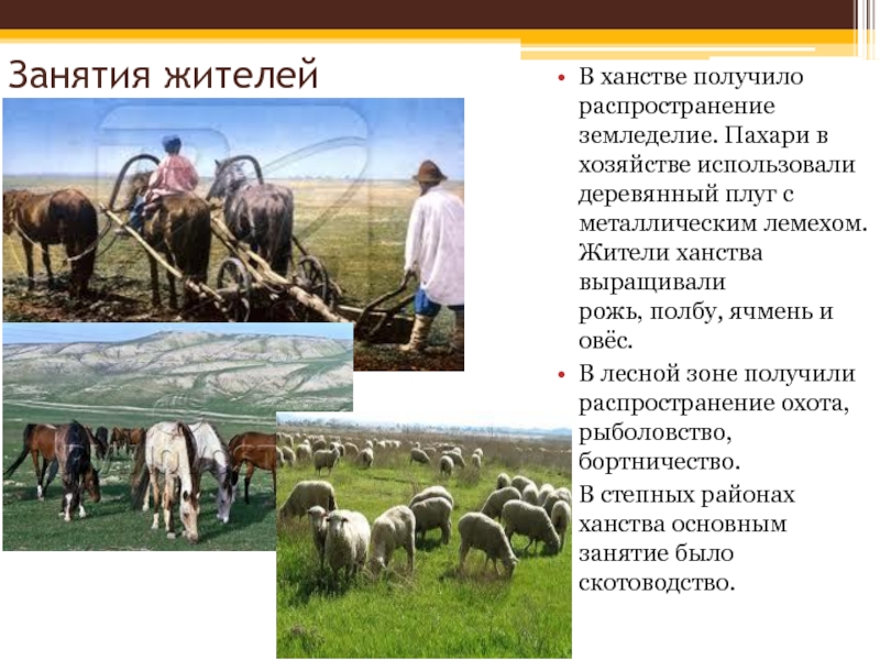 В ханстве получило распространение земледелие. Пахари в хозяйстве использовали деревянный