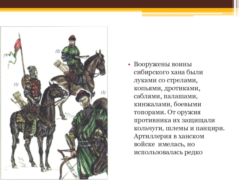 Вооружены воины сибирского хана были луками со стрелами, копьями, дротиками, саблями,