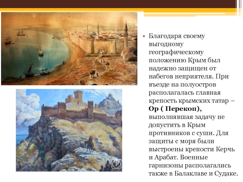 неприятеля. При въезде на полуостров располагалась главная крепость крымских татар – Ор ( Перекоп), выполнявшая задачу не допустить в Крым противников с суши. Для защиты с моря были выстроены крепости Керчь и Арабат. Военные гарнизоны располагались также в Балаклаве и Судаке.