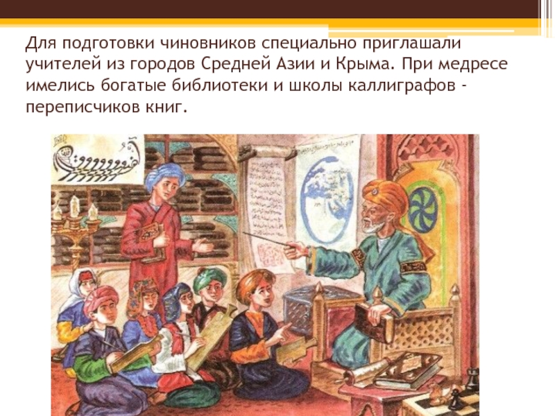 Слайд 21Для подготовки чиновников специально приглашали учителей из городов Средней Азии и