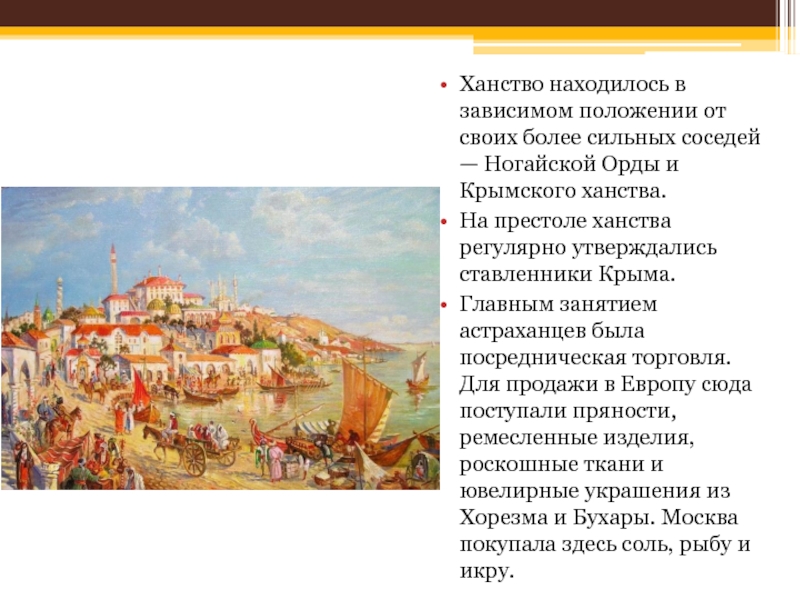 Главным занятием астраханцев была посредническая торговля. Для продажи в Европу сюда поступали пряности, ремесленные изделия, роскошные ткани и ювелирные украшения из Хорезма и Бухары. Москва покупала здесь соль, рыбу и икру.