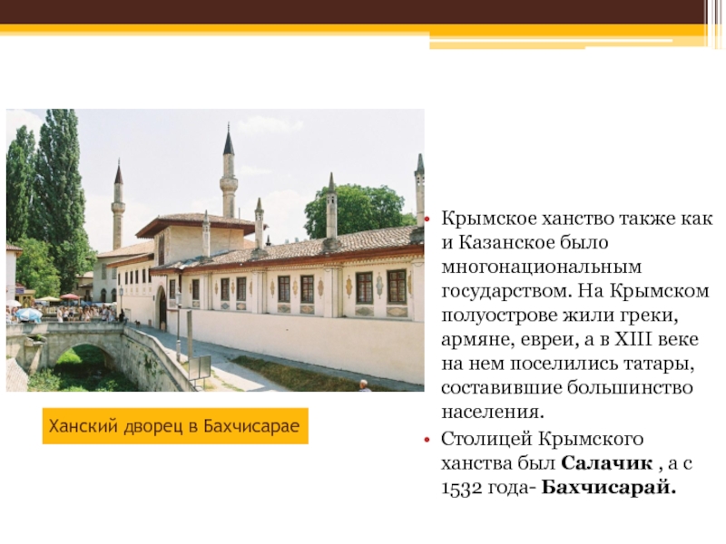 Столицей Крымского ханства был Салачик , а с 1532 года- Бахчисарай.