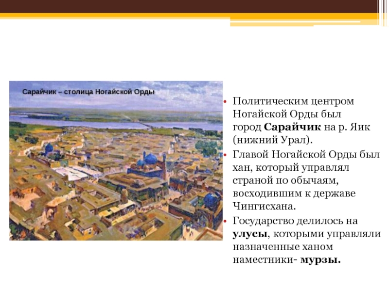 Политическим центром Ногайской Орды был город Сарайчик на р. Яик (нижний Урал).
