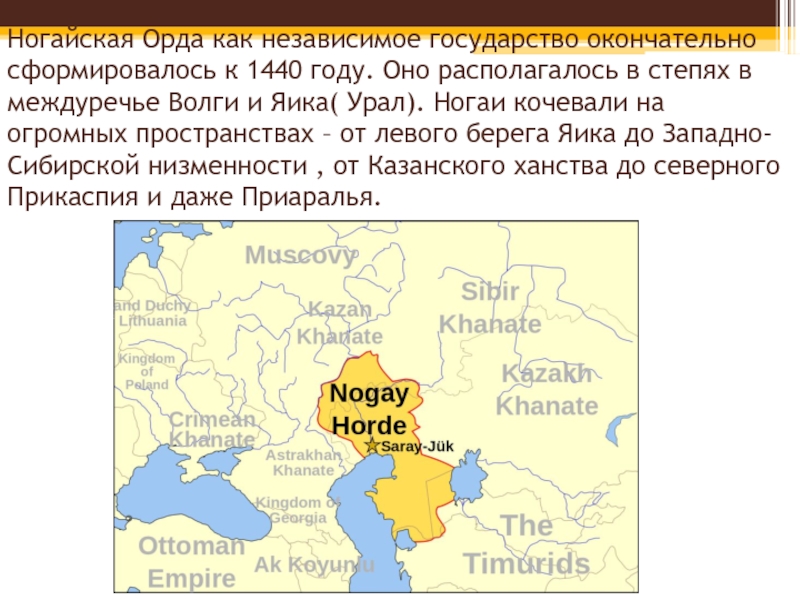 Слайд 38Ногайская Орда как независимое государство окончательно сформировалось к 1440 году. Оно