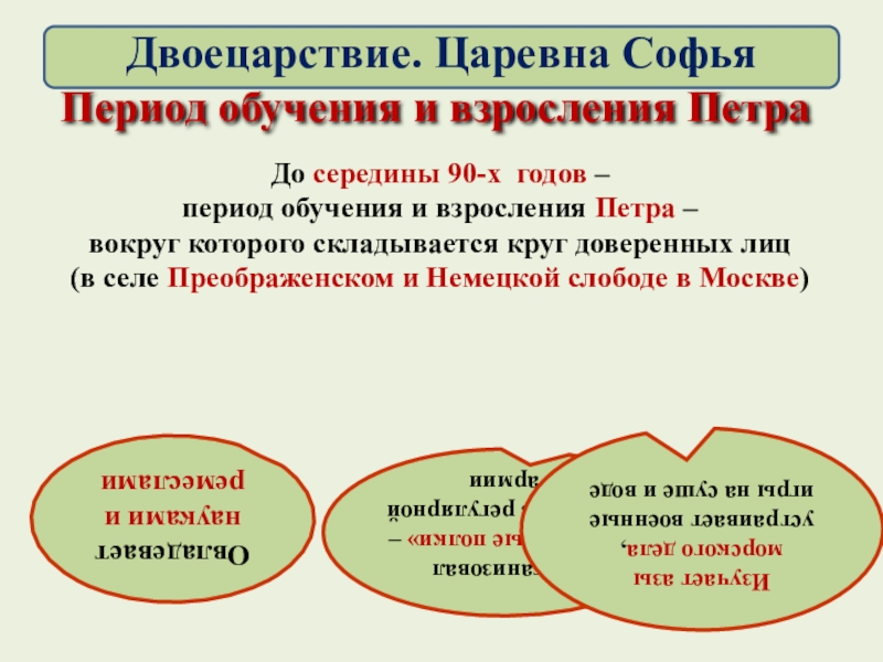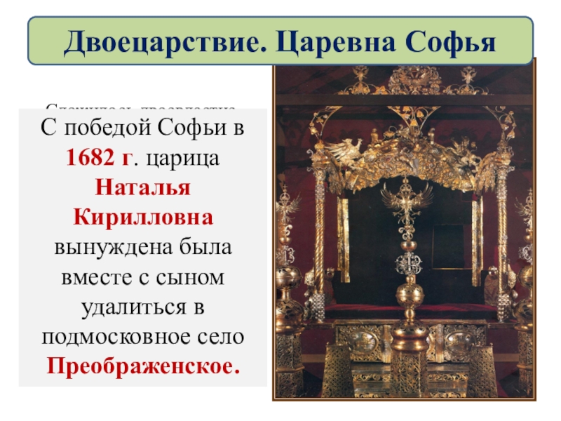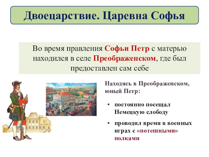 С победой Софьи в 1682 г. царица Наталья Кирилловна вынуждена была вместе с сыном удалиться в подмосковное село Преображенское.