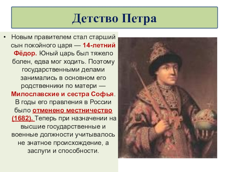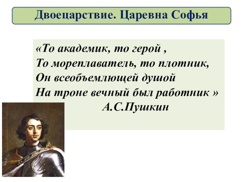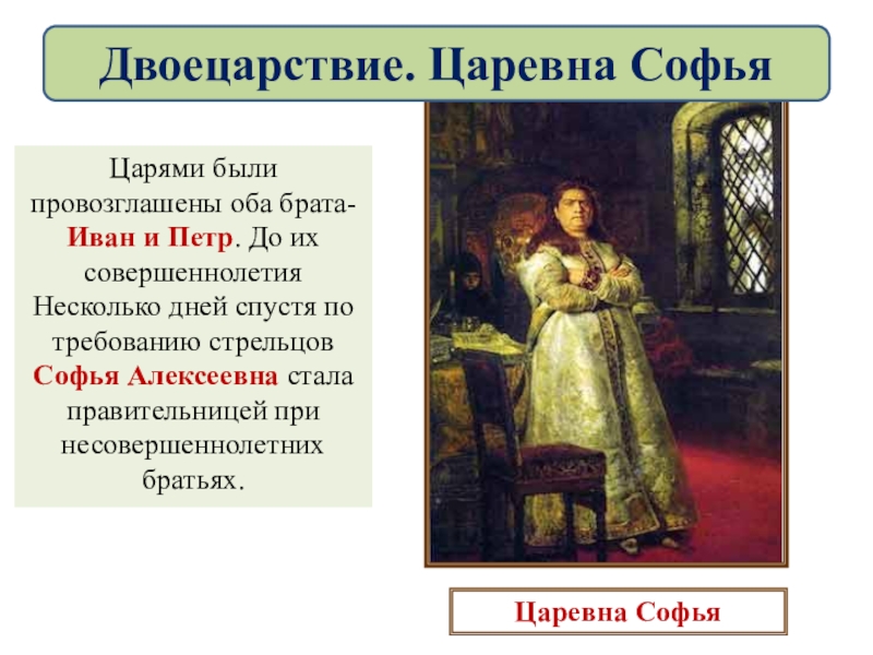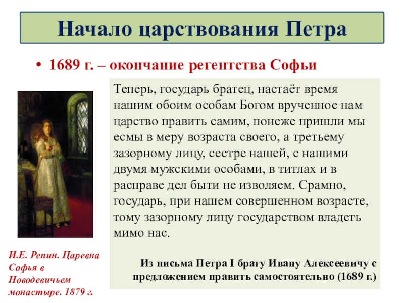 Теперь, государь братец, настаёт время нашим обоим особам Богом врученное нам царство править самим, понеже пришли мы есмы в меру возраста своего, а третьему зазорному лицу, сестре нашей, с нашими двумя мужскими особами, в титлах и в расправе дел быти не изволяем. Срамно, государь, при нашем совершенном возрасте, тому зазорному лицу государством владеть мимо нас.