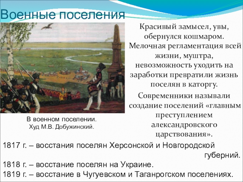 1819 г. – восстание в Чугуевском и Таганрогском поселениях.