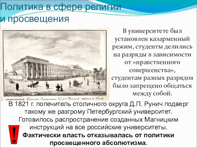 В 1821 г. попечитель столичного округа Д.П. Рунич подверг такому же разгрому Петербургский университет.