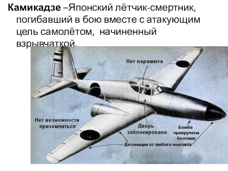 Слайд 6Камикадзе –Японский лётчик-смертник, погибавший в бою вместе с атакующим цель самолётом,