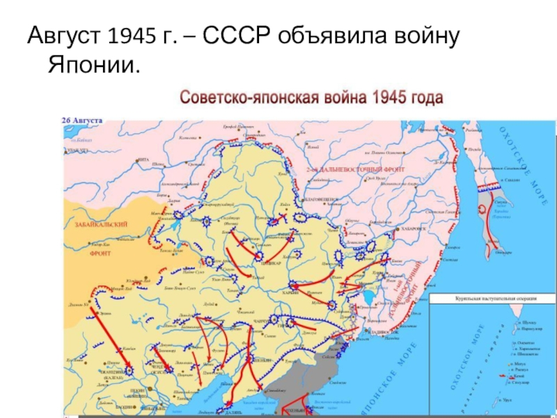 Слайд 7Август 1945 г. – СССР объявила войну Японии.