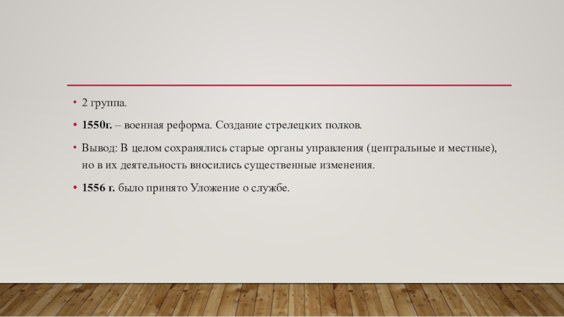 1550 – принятие нового Судебника. Увеличен размер пожилого при переходе крестьян в Юрьев день. Закончилось формирование системы центральных органов управления – приказов. Каждый ведал определенными государственными делами.