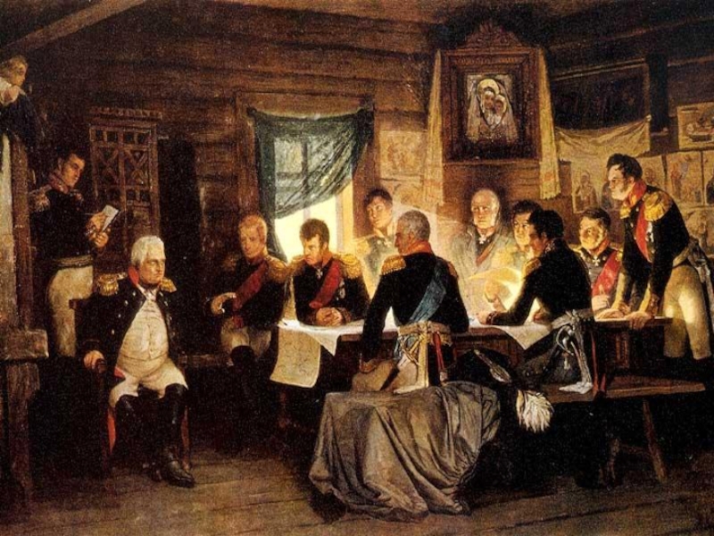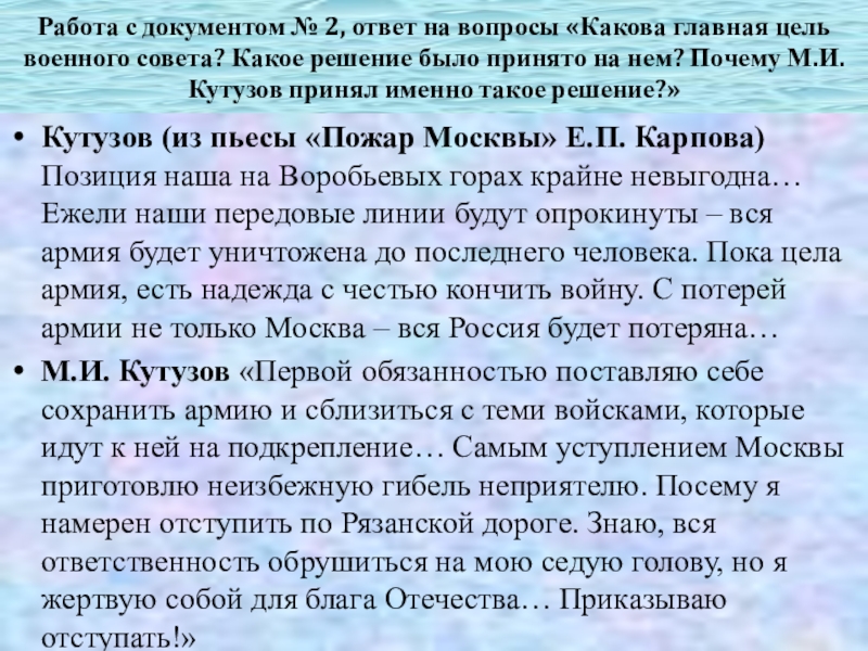 Работа с документом № 2, ответ на вопросы «Какова главная цель военного совета? Какое решение было принято на нем? Почему М.И. Кутузов принял именно такое решение?»