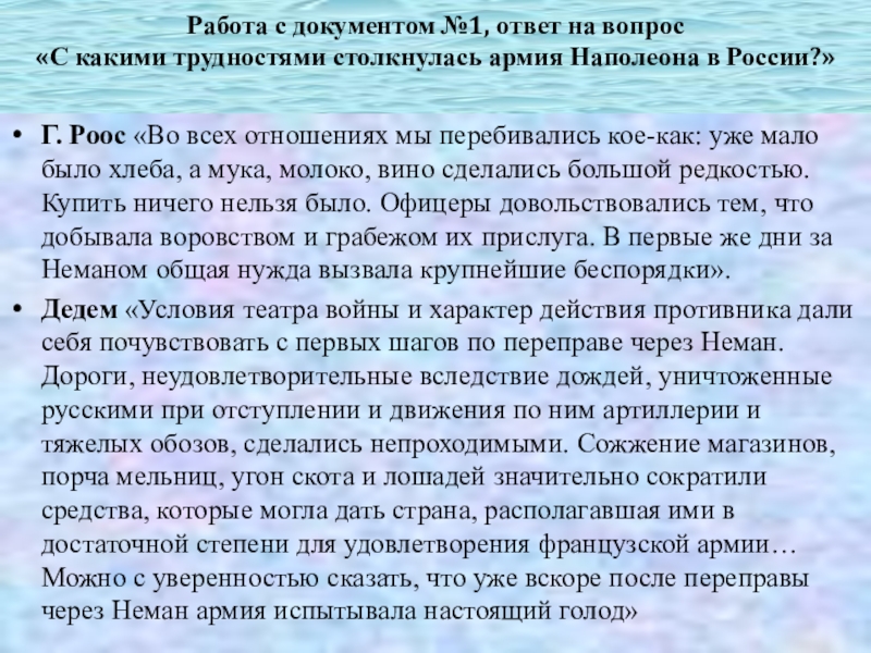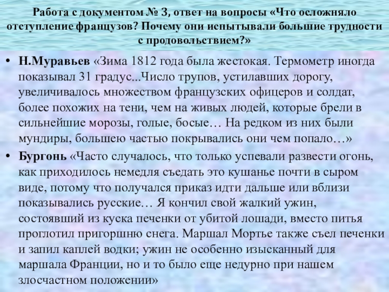 Работа с документом № 3, ответ на вопросы «Что осложняло отступление французов? Почему они испытывали большие трудности с продовольствием?»