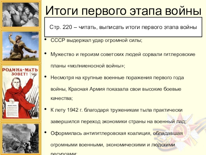 Стр. 220 – читать, выписать итоги первого этапа войны