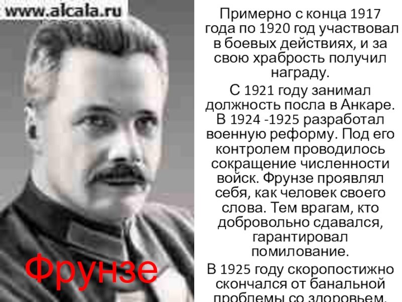 С 1921 году занимал должность посла в Анкаре. В 1924 -1925 разработал военную реформу. Под его контролем проводилось сокращение численности войск. Фрунзе проявлял себя, как человек своего слова. Тем врагам, кто добровольно сдавался, гарантировал помилование.
