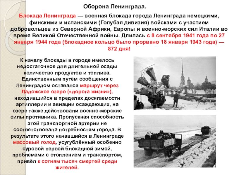 К началу блокады в городе имелось недостаточное для длительной осады количество продуктов и топлива. Единственным путём сообщения с Ленинградом оставался маршрут через Ладожское озеро («дорога жизни»), находившийся в пределах досягаемости артиллерии и авиации осаждающих, на озере также действовали военно-морские силы противника. Пропускная способность этой транспортной артерии не соответствовала потребностям города. В результате этого начавшийся в Ленинграде массовый голод, усугублённый особенно суровой первой блокадной зимой, проблемами с отоплением и транспортом, привёл к сотням тысяч смертей среди жителей.