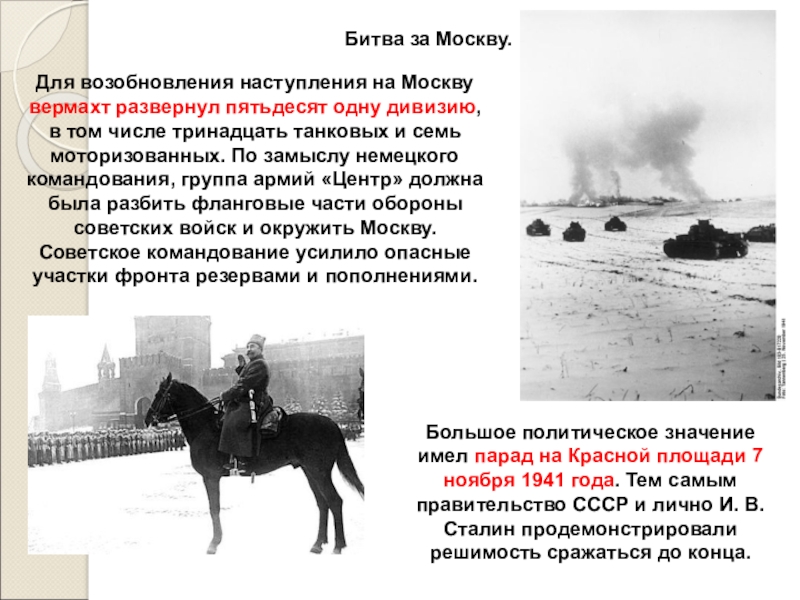 Большое политическое значение имел парад на Красной площади 7 ноября 1941 года. Тем самым правительство СССР и лично И. В. Сталин продемонстрировали решимость сражаться до конца.