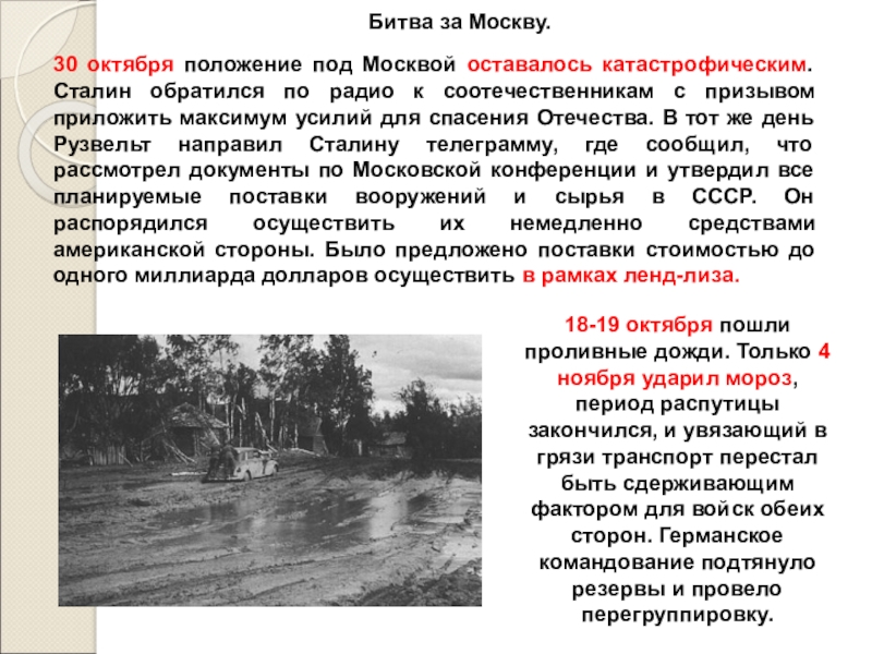 30 октября положение под Москвой оставалось катастрофическим. Сталин обратился по радио к соотечественникам с призывом приложить максимум усилий для спасения Отечества. В тот же день Рузвельт направил Сталину телеграмму, где сообщил, что рассмотрел документы по Московской конференции и утвердил все планируемые поставки вооружений и сырья в СССР. Он распорядился осуществить их немедленно средствами американской стороны. Было предложено поставки стоимостью до одного миллиарда долларов осуществить в рамках ленд-лиза.