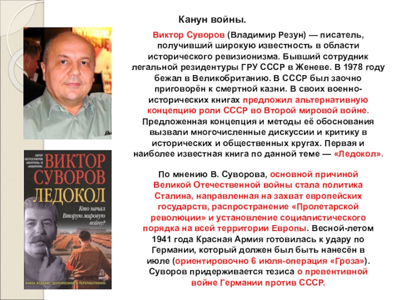 По мнению В. Суворова, основной причиной Великой Отечественной войны стала политика Сталина, направленная на захват европейских государств, распространение «Пролетарской революции» и установление социалистического порядка на всей территории Европы. Весной-летом 1941 года Красная Армия готовилась к удару по Германии, который должен был быть нанесён в июле (ориентировочно 6 июля-операция «Гроза»). Суворов придерживается тезиса о превентивной войне Германии против СССР.