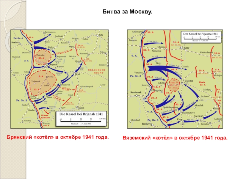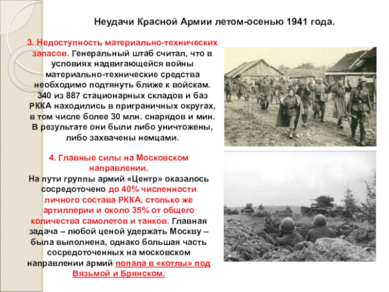 На пути группы армий «Центр» оказалось сосредоточено до 40% численности личного состава РККА, столько же артиллерии и около 35% от общего количества самолетов и танков. Главная задача – любой ценой удержать Москву – была выполнена, однако большая часть сосредоточенных на московском направлении армий попала в «котлы» под Вязьмой и Брянском.