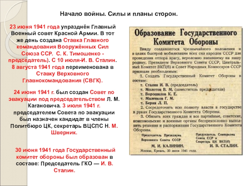 30 июня 1941 года Государственный комитет обороны был образован в составе: Председатель ГКО — И. В. Сталин.