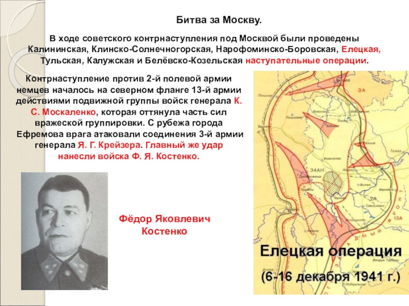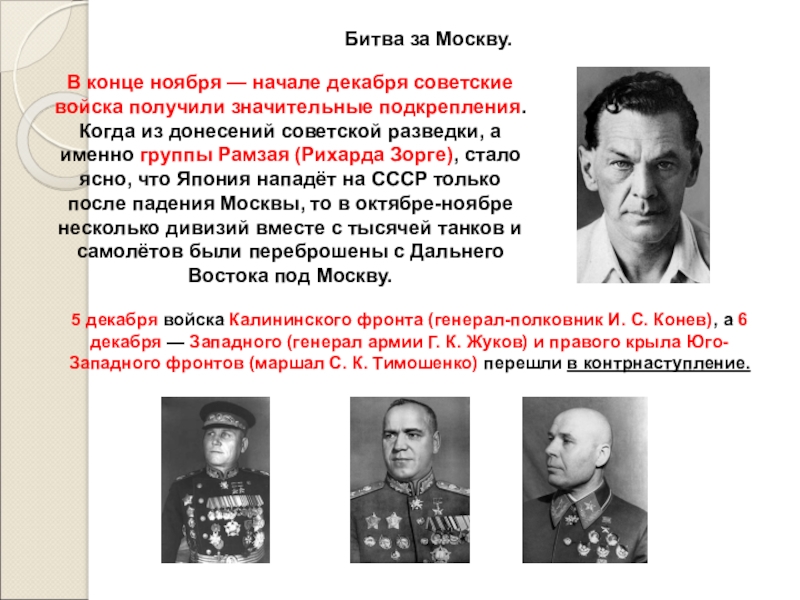 5 декабря войска Калининского фронта (генерал-полковник И. С. Конев), а 6 декабря — Западного (генерал армии Г. К. Жуков) и правого крыла Юго-Западного фронтов (маршал С. К. Тимошенко) перешли в контрнаступление.