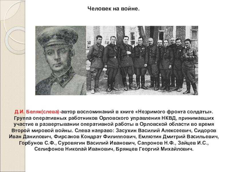 оперативных работников Орловского управления НКВД, принимавших участие в развертывании оперативной работы в Орловской области во время Второй мировой войны. Слева направо: Засухин Василий Алексеевич, Сидоров Иван Данилович, Фирсанов Кондрат Филиппович, Емлютин Дмитрий Васильевич, Горбунов С.Ф., Суровягин Василий Иванович, Сапронов Н.Ф., Зайцев И.С., Селифонов Николай Иванович, Брянцев Георгий Михайлович.