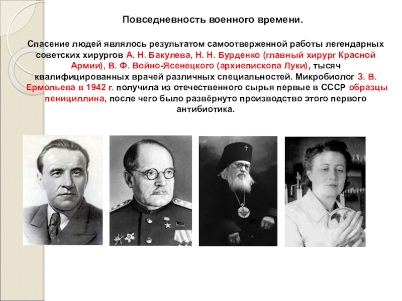 А. Н. Бакулева, Н. Н. Бурденко (главный хирург Красной Армии), В. Ф. Войно-Ясенецкого (архиепископа Луки), тысяч квалифицированных врачей различных специальностей. Микробиолог З. В. Ермольева в 1942 г. получила из отечественного сырья первые в СССР образцы пенициллина, после чего было развёрнуто производство этого первого антибиотика.