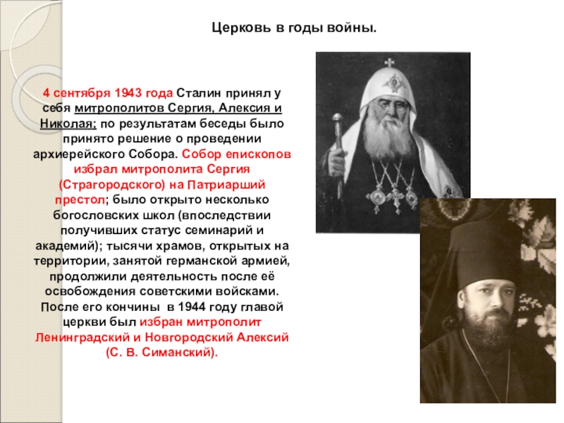 себя митрополитов Сергия, Алексия и Николая; по результатам беседы было принято решение о проведении архиерейского Собора. Собор епископов избрал митрополита Сергия (Страгородского) на Патриарший престол; было открыто несколько богословских школ (впоследствии получивших статус семинарий и академий); тысячи храмов, открытых на территории, занятой германской армией, продолжили деятельность после её освобождения советскими войсками. После его кончины в 1944 году главой церкви был избран митрополит Ленинградский и Новгородский Алексий (С. В. Симанский).