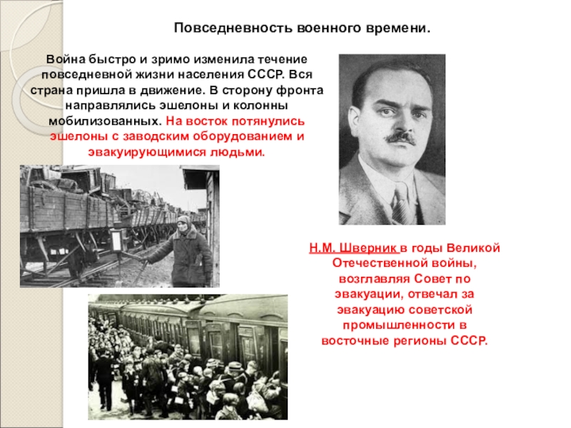 Н.М. Шверник в годы Великой Отечественной войны, возглавляя Совет по эвакуации, отвечал за эвакуацию советской промышленности в восточные регионы СССР.