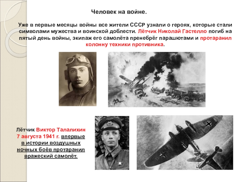 о героях, которые стали символами мужества и воинской доблести. Лётчик Николай Гастелло погиб на пятый день войны, экипаж его самолёта пренебрёг парашютами и протаранил колонну техники противника.