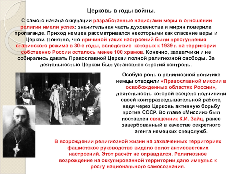 меры в отношении религии имели успех: значительная часть духовенства и мирян поверила пропаганде. Приход немцев рассматривался некоторыми как спасение веры и Церкви. Понятно, что причиной таких настроений были преступления сталинского режима в 30-е годы, вследствие которых к 1939 г. на территории собственно России осталось менее 100 храмов. Конечно, захватчики и не собирались давать Православной Церкви полной религиозной свободы. За деятельностью Церкви был установлен строгий контроль.