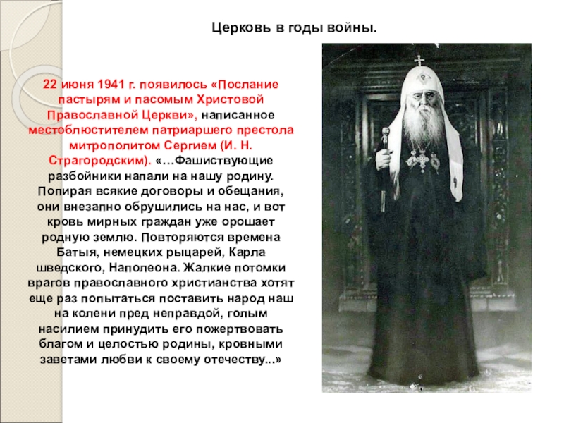 и пасомым Христовой Православной Церкви», написанное местоблюстителем патриаршего престола митрополитом Сергием (И. Н. Страгородским). «…Фашиствующие разбойники напали на нашу родину. Попирая всякие договоры и обещания, они внезапно обрушились на нас, и вот кровь мирных граждан уже орошает родную землю. Повторяются времена Батыя, немецких рыцарей, Карла шведского, Наполеона. Жалкие потомки врагов православного христианства хотят еще раз попытаться поставить народ наш на колени пред неправдой, голым насилием принудить его пожертвовать благом и целостью родины, кровными заветами любви к своему отечеству...»