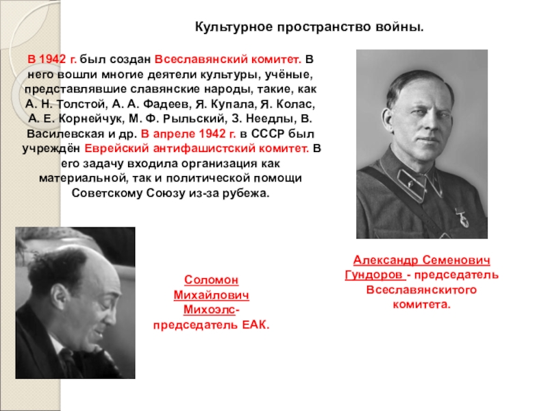 вошли многие деятели культуры, учёные, представлявшие славянские народы, такие, как А. Н. Толстой, А. А. Фадеев, Я. Купала, Я. Колас, А. Е. Корнейчук, М. Ф. Рыльский, З. Неедлы, В. Василевская и др. В апреле 1942 г. в СССР был учреждён Еврейский антифашистский комитет. В его задачу входила организация как материальной, так и политической помощи Советскому Союзу из-за рубежа.