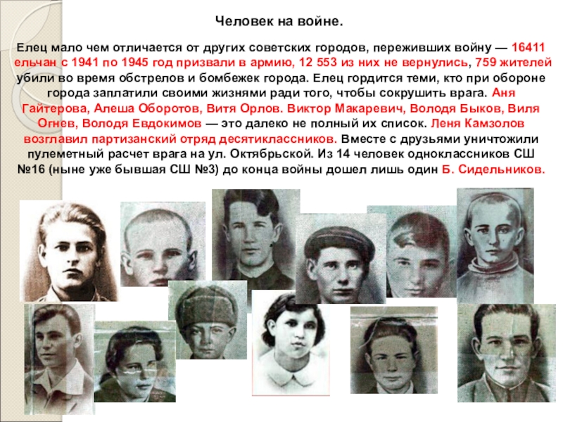 войну — 16411 ельчан с 1941 по 1945 год призвали в армию, 12 553 из них не вернулись, 759 жителей убили во время обстрелов и бомбежек города. Елец гордится теми, кто при обороне города заплатили своими жизнями ради того, чтобы сокрушить врага. Аня Гайтерова, Алеша Оборотов, Витя Орлов. Виктор Макаревич, Володя Быков, Виля Огнев, Володя Евдокимов — это далеко не полный их список. Леня Камзолов возглавил партизанский отряд десятиклассников. Вместе с друзьями уничтожили пулеметный расчет врага на ул. Октябрьской. Из 14 человек одноклассников СШ №16 (ныне уже бывшая СШ №3) до конца войны дошел лишь один Б. Сидельников.