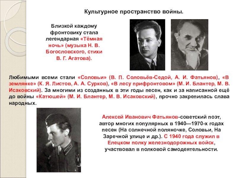 Алексей Иванович Фатьянов-советский поэт, автор многих популярных в 1940—1970-х годах песен (На солнечной поляночке, Соловьи, На Заречной улице и др.). С 1940 года служил в Елецком полку железнодорожных войск, участвовал в полковой самодеятельности.