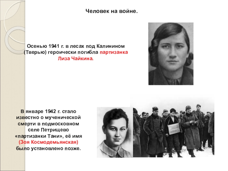 В январе 1942 г. стало известно о мученической смерти в подмосковном селе Петрищево «партизанки Тани», её имя (Зоя Космодемьянская) было установлено позже.