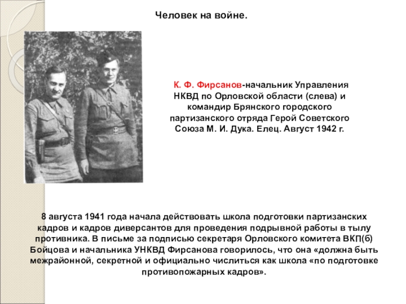 8 августа 1941 года начала действовать школа подготовки партизанских кадров и кадров диверсантов для проведения подрывной работы в тылу противника. В письме за подписью секретаря Орловского комитета ВКП(б) Бойцова и начальника УНКВД Фирсанова говорилось, что она «должна быть межрайонной, секретной и официально числиться как школа «по подготовке противопожарных кадров».