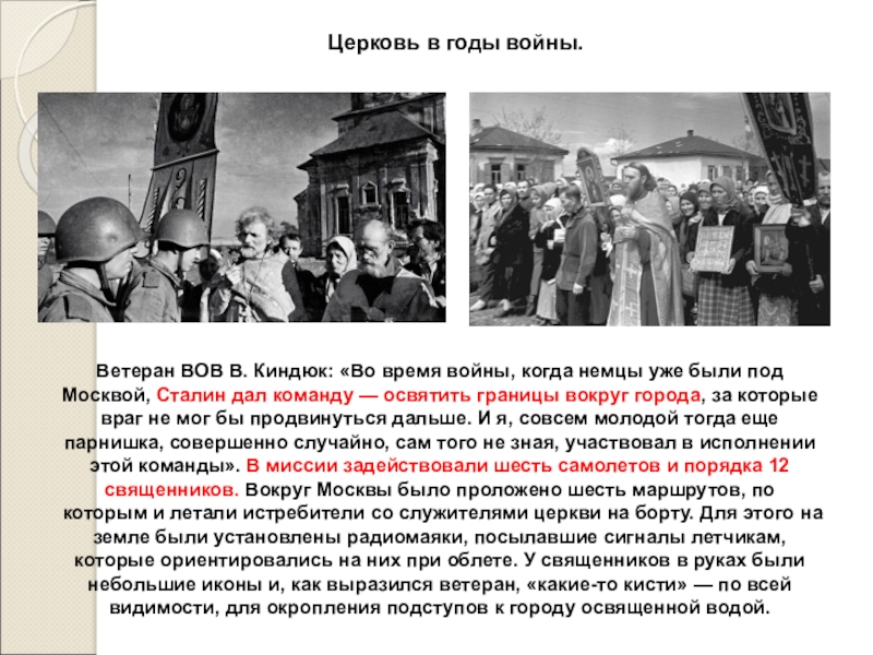 когда немцы уже были под Москвой, Сталин дал команду — освятить границы вокруг города, за которые враг не мог бы продвинуться дальше. И я, совсем молодой тогда еще парнишка, совершенно случайно, сам того не зная, участвовал в исполнении этой команды». В миссии задействовали шесть самолетов и порядка 12 священников. Вокруг Москвы было проложено шесть маршрутов, по которым и летали истребители со служителями церкви на борту. Для этого на земле были установлены радиомаяки, посылавшие сигналы летчикам, которые ориентировались на них при облете. У священников в руках были небольшие иконы и, как выразился ветеран, «какие-то кисти» — по всей видимости, для окропления подступов к городу освященной водой.