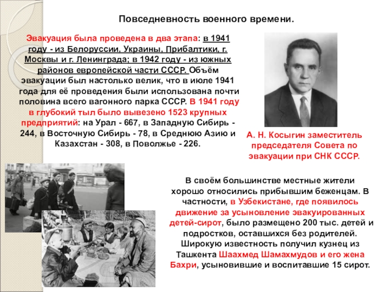 А. Н. Косыгин заместитель председателя Совета по эвакуации при СНК СССР.