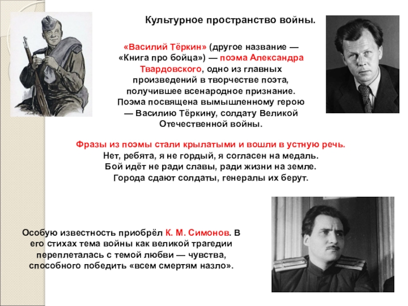 поэма Александра Твардовского, одно из главных произведений в творчестве поэта, получившее всенародное признание. Поэма посвящена вымышленному герою — Василию Тёркину, солдату Великой Отечественной войны.