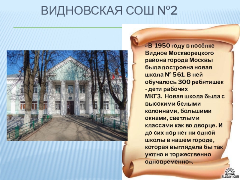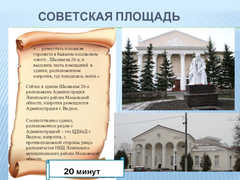 Сейчас в здании Школьная 26-а расположена Администрация Ленинского района Московской области, напротив размещается Администрация г. Видное.