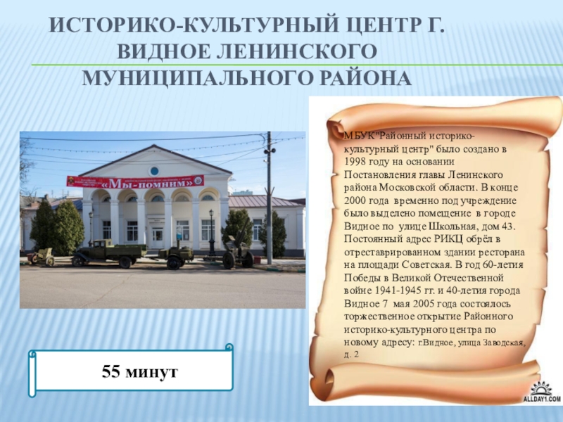 Соответственно здание, расположенное рядом с Администрацией – это ЦДКиД г.Видное, напротив, с противоположной стороны улица располагается ИКЦ Ленинского муниципального района Московской области.