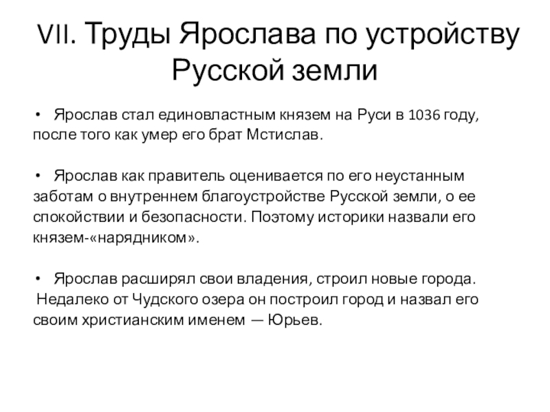 Слайд 16VII. Труды Ярослава по устройству Русской земли
