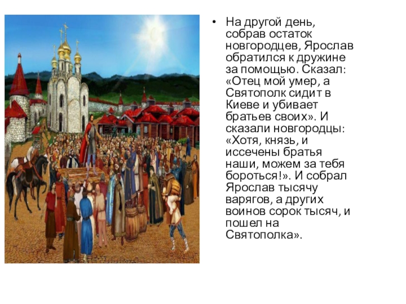 помощью. Сказал: «Отец мой умер, а Святополк сидит в Киеве и убивает братьев своих». И сказали новгородцы: «Хотя, князь, и иссечены братья наши, можем за тебя бороться!». И собрал Ярослав тысячу варягов, а других воинов сорок тысяч, и пошел на Святополка».