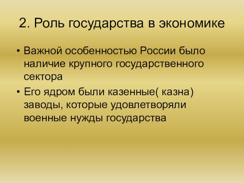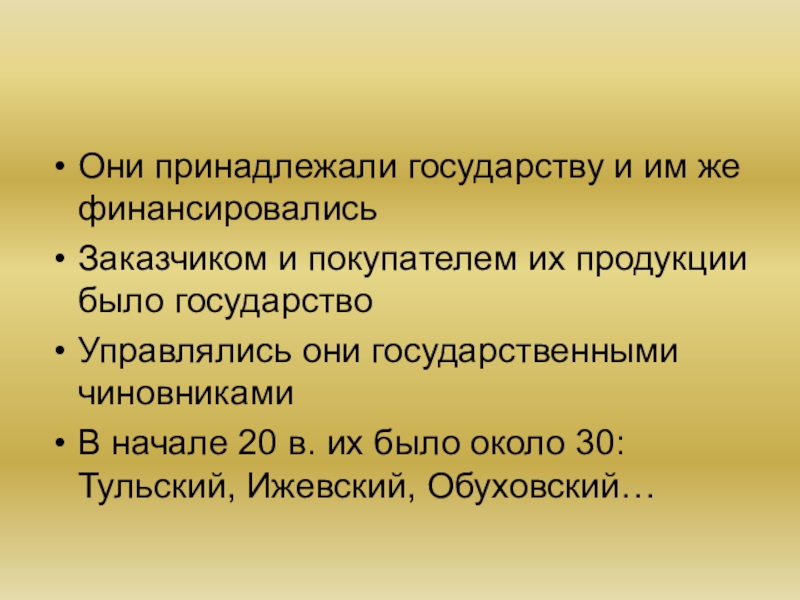 Его ядром были казенные( казна) заводы, которые удовлетворяли военные нужды государства