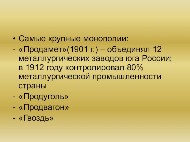 «Продамет»(1901 г.) – объединял 12 металлургических заводов юга России;
