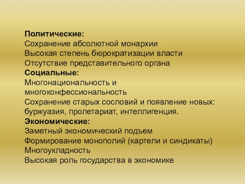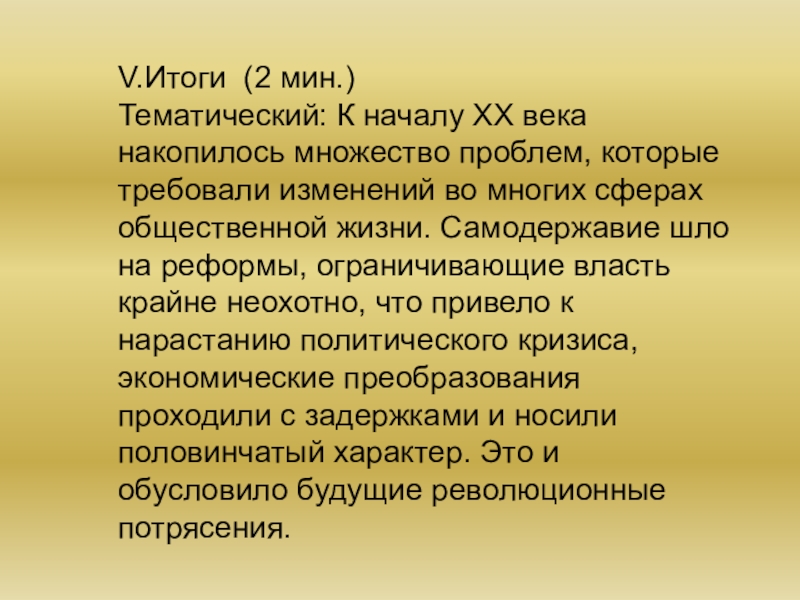 требовали изменений во многих сферах общественной жизни. Самодержавие шло на реформы, ограничивающие власть крайне неохотно, что привело к нарастанию политического кризиса, экономические преобразования проходили с задержками и носили половинчатый характер. Это и обусловило будущие революционные потрясения.
