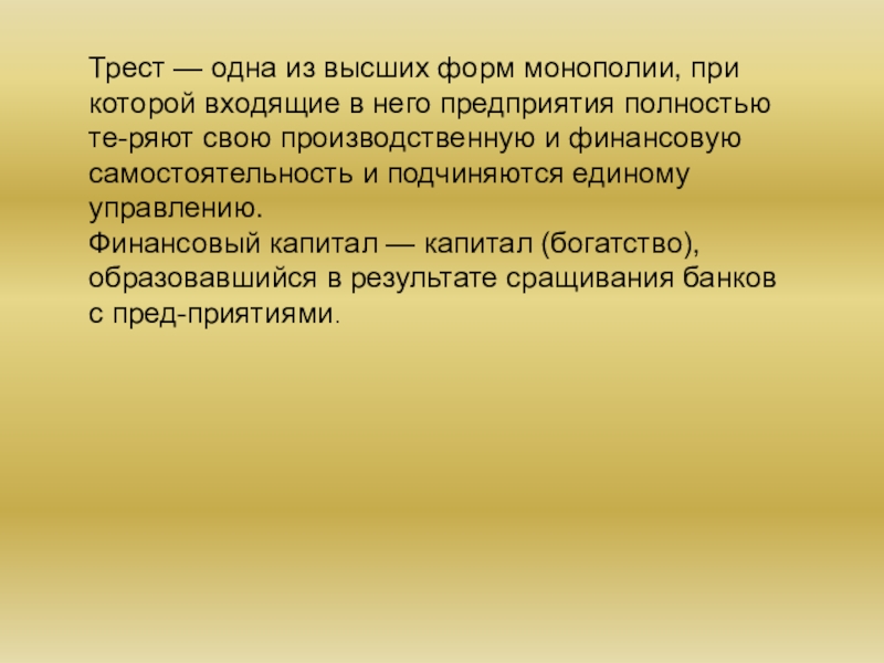 Финансовый капитал — капитал (богатство), образовавшийся в результате сращивания банков с пред-приятиями.